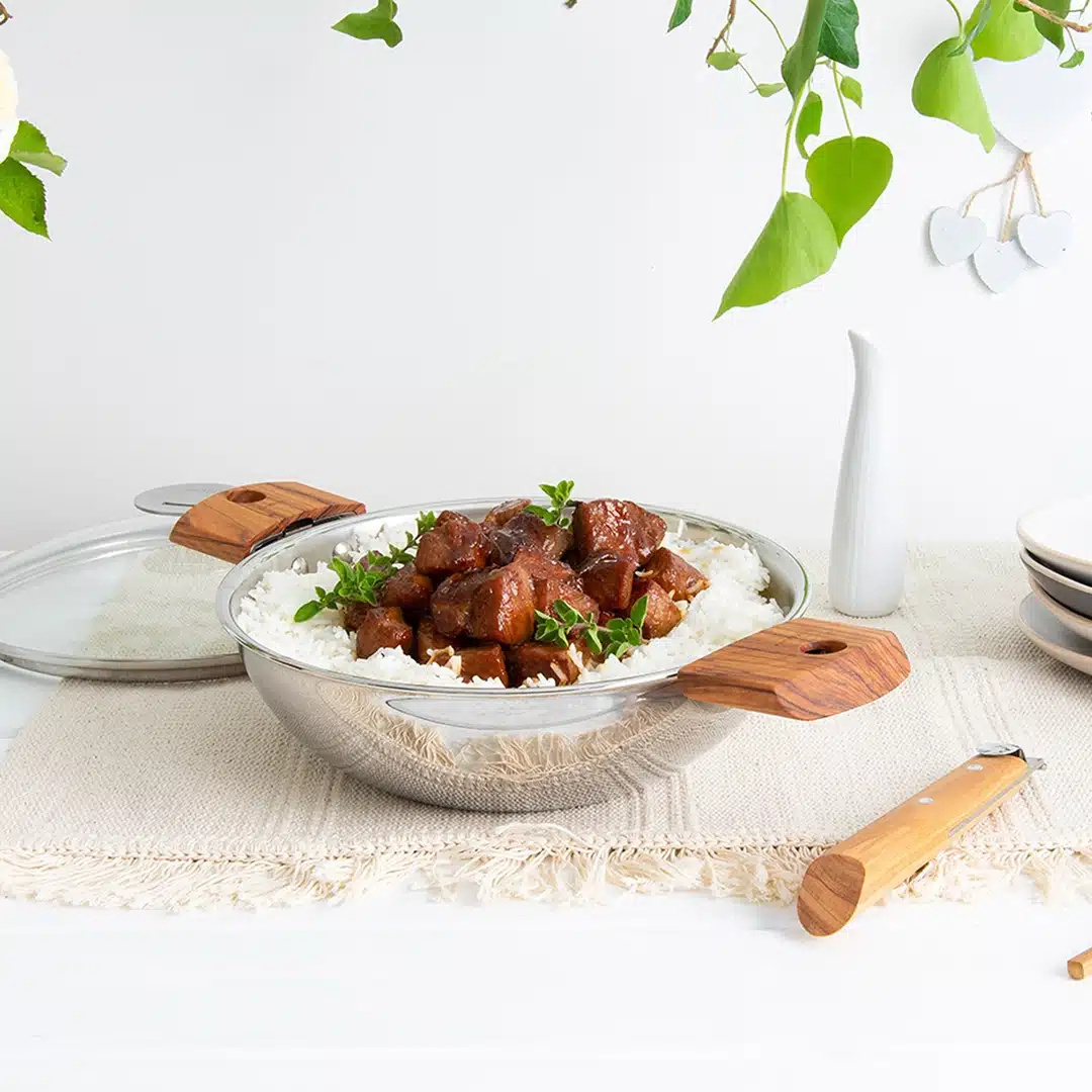 Der abnehmbare Seitengriff der Casteline Kollektion verbindet Funktionalität mit natürlicher Eleganz. Gefertigt aus massivem Olivenholz liegt er angenehm in der Hand und ermöglicht ein sicheres Handling von Kochgeschirr. Dank des automatischen Edelstahl-Mechanismus lässt sich der Griff bequem mit einer Hand befestigen oder abnehmen. Während des Kochens kann er entfernt werden – ideal für mehr Sicherheit und eine stilvolle Präsentation direkt am Tisch. Die natürliche Maserung macht jeden Griff zu einem einzigartigen Stück.