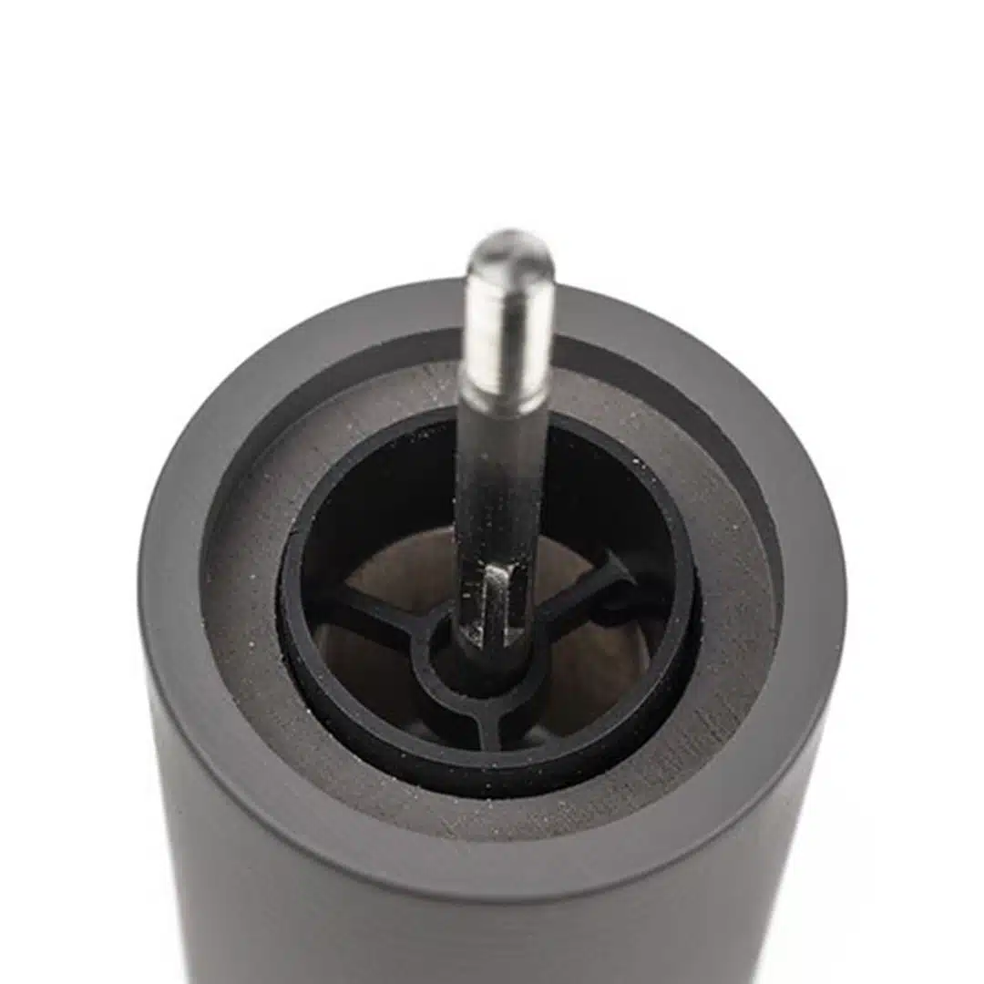 - Einstellbarer Mahlgrad über Kopfschraube: je fester die Schraube, desto feiner der Mahlgrad